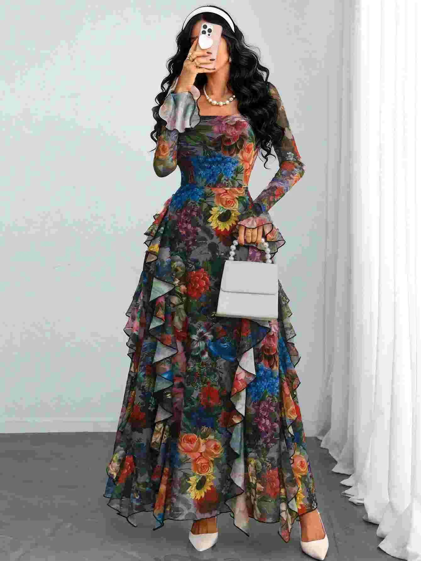 يأتي هذا الفستان ليجسد التوازن المثالي بين الراحة والفخامة. يتميز بخصر محدد يبرز جمال القوام، مع أكمام طويلة مزينة بكشاكش ناعمة تضفي لمسة من الحركة الحيوية. القماش المنقوش بالزهور الملونة على خلفية داكنة يعزز من فخامة التصميم ويجعله قطعة فريدة تخطف الأنظار في أي تجمع.